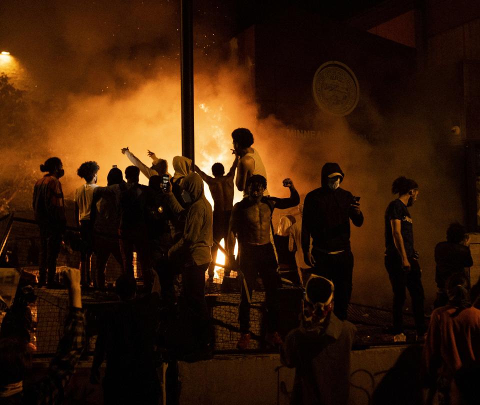 Con la caída del día, los saqueos e incendios proliferaron por la ciudad mientras miles de manifestantes se agruparon alrededor de la estación de Policía del Tercer Precinto de Minneapolis, convertida en un símbolo de la protesta por la muerte de Floyd, de acuerdo a reportes del periódico local Star Tribune.